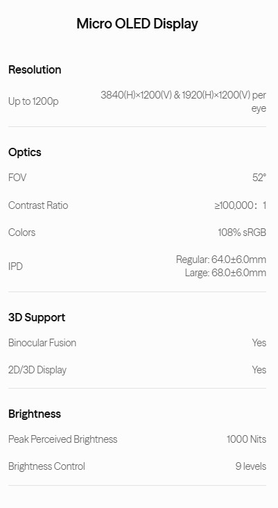 - Display: 152" 120Hz 1200p Micro-OLED
